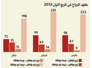 ووفقا للإحصائيات فإن عقود الزواج للمواطنين المتزوجين من مواطنات في الربع الأول من 2012 بلغ 272 عقداً، و38 عقد زواج لغير المواطنين من زوجة مواطنة و656 عقد زواج لغير المواطنين المتزوجين من غير مواطنات. أما في الربع الاول من عام 2011، فبلغت عقود زواج المواطنين المتزوجين من مواطنات 299 عقدا، وبلغ عدد عقود زواج غير المواطنين من مواطنات 38 عقدا وعقود غير المواطنين المتزوجين من غير مواطنات 531 عقدا.