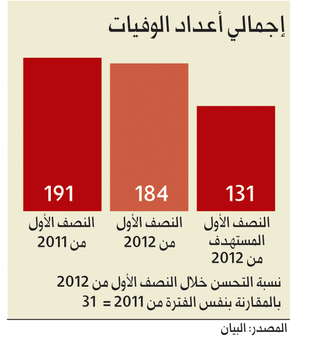 وأكد العميد مهندس حسين الحارثي مدير مديرية المرور والدوريات بالقيادة العامة لشرطة أبوظبي خلال المؤتمر الصحفي الذي عقد أمس بمقر المديرية عن تحقيق تحسن جوهري في مستويات السلامة المرورية خلال النصف الاول من العام الجاري 2012 مشيرا الى ان النتائج أظهرت انخفاض الوفيات على طريقي (أبوظبي السلع) حميم بنسبة 60 ٪ وذلك على الرغم من زيادة عدد المركبات المسجلة بنحو 16 ٪ والتي بلغت خلال النصف الاول من العام الجاري 808 آلاف و369 مركبة والسائقين بنحو 22 ٪.
