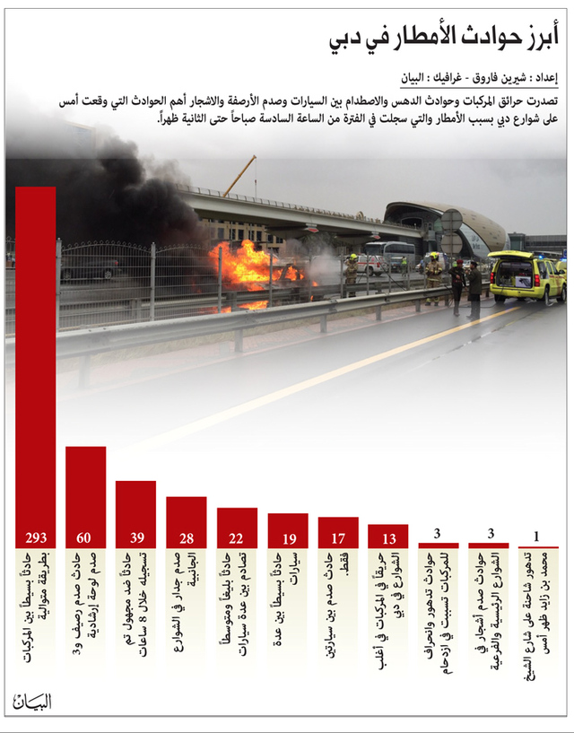 وقال العميد عمر الشامسي، نائب مدير الإدارة العامة للعمليات في شرطة دبي، إن الحوادث المسجلة وقعت بين الساعة السادسة صباحاً حتى الساعة 2 ظهر أمس التي شهدت هطول أمطار غزيرة على مناطق متفرقة على جميع أنحاء الدولة، وتسببت تلك الأمطار والحوادث في ازدحام كبير على كل الطرقات، خاصة القادمين من الإمارات الشمالية إلى دبي على شوارع محمد بن زايد والإمارات ودبي العابر والاتحاد، كما تسبب تجمع المياه في تعطل بعض المركبات، ما تسبب في شلل كبير في حركة السير بالقرب من الجسور والأنفاق.