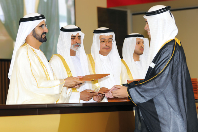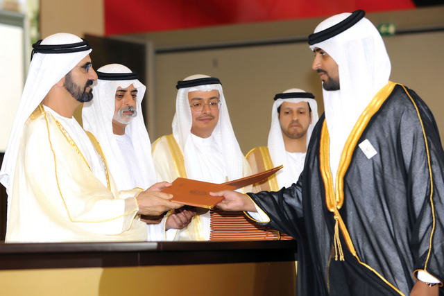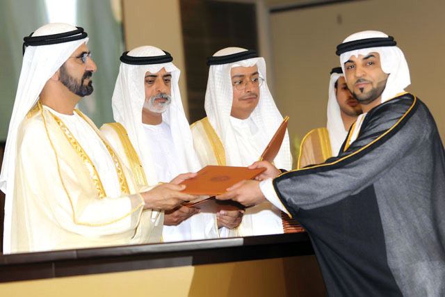 وعقب الكلمات اعتلى صاحب السمو الشيخ محمد بن راشد آل مكتوم منصة التكريم والى جانبه معالي الشيخ نهيان بن مبارك آل نهيان والدكتور عبدالله الخنبشي مدير الجامعة حيث تلقى سموه هدية الجامعة التذكارية وقام سموه بتسليم الشهادات والدرجات العلمية العالية الى الخريجين البالغ عددهم حوالي ثمانمئة وثلاثين طالبا من مختلف التخصصات ومن بينهم عدد من الحاصلين على درجة الماجستير حيث صافحهم سموه وهنأهم في يوم تخرجهم في جامعتهم التي احتضنتهم بكل الاهتمام والاعتزاز، متمنيا لهم مستقبلا واعدا آخذين بعين الاعتبار خدمة وطنهم أولا حتى يظل شامخا عزيزا بأبنائه وبناته ومسيجا بالعلم والكفاءات العلمية الوطنية.