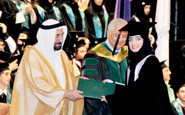 وسلم صاحب السمو حاكم الشارقة يرافقه الأستاذ الدكتور سامي محمود مدير الجامعة والأستاذ الدكتور حسام الدين حمدي نائب مدير الجامعة لشؤون الكليات الطبية والعلوم الصحية الخريجين والخريجات شهادات تخرجهم مهنئا كل واحد منهم ومتمنيا له النجاح والتوفيق في حياته المهنية المقبلة.
