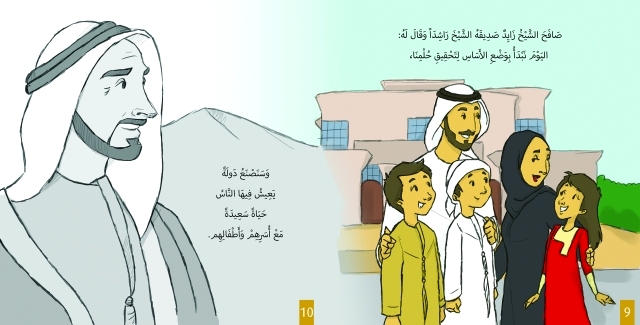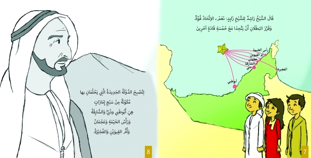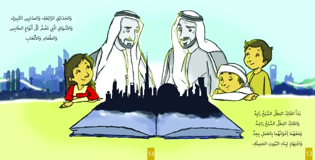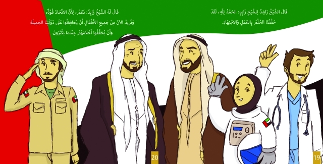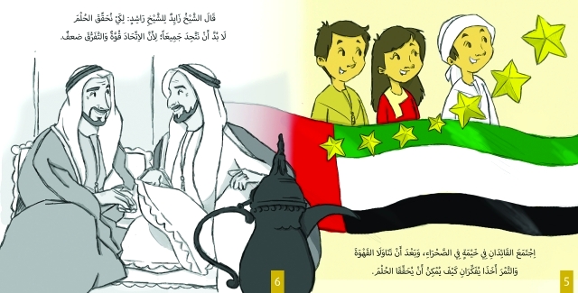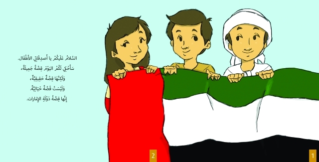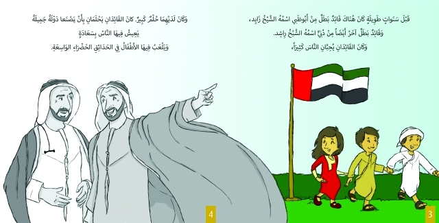 وتقول قصة "القائدان البطلان": قبل سنوات طويلة كان هناك قائد بطل من أبوظبي اسمه الشيخ زايد، وقائد بطل آخر أيضاً من دبي اسمه الشيخ راشد، وكان القائدان يحبان الناس كثيراً، وكان لديهما حلم كبير.