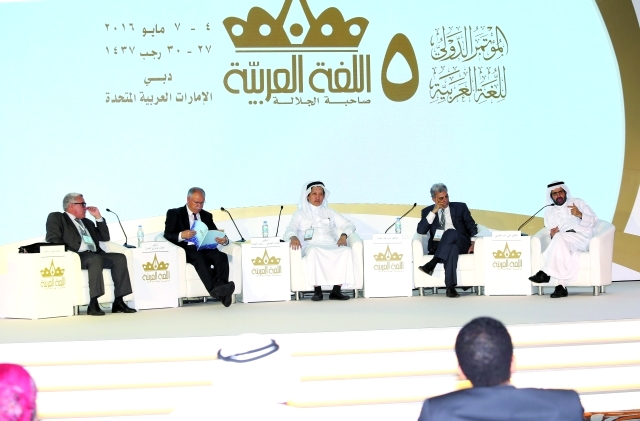 تناولت الجلسة الافتتاحية الأولى في المؤتمر الدولي الخامس للغة العربية، جهود الجامعات العربية في خدمة اللغة، والمشاكل والتحديات التي تواجهها، فضلاً عن تجارب الجامعات العربية للانطلاق بها لآفاق أكبر من الانتشار والقوة، وشارك فيها الدكتور علي راشد النعيمي مدير جامعة الإمارات، والدكتور جابر نصار رئيس جامعة القاهرة، والدكتور حميد بن شنيتي رئيس جامعة الجزائر، والدكتور سلطان عدوان الأمين العام لاتحاد الجامعات العربية.