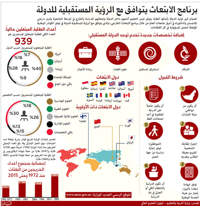 وقامت الوزارة بإعادة النظر في برنامج الابتعاث للعام 2016-2017 وتطويره ليشمل التخصصات التي تخدم توجه الدولة المستقبلي المتعلق بالابتكار، واستشراف المستقبل، وعلم الفضاء، وريادة الأعمال.