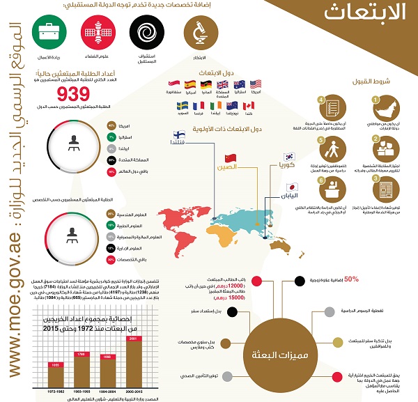 وتنفيذاً لاستراتيجية الدولة الرامية إلى تعزيز مكانة الدولة في مؤشرات التنافسية العالمية، وتماشيا مع الاستراتيجية الوطنية للابتكار التي تهدف لجعل دولة الإمارات ضمن الدول الأكثر ابتكاراً على مستوى العالم خلال السنوات السبع المقبلة، قامت الوزارة بإعادة النظر في برنامج الابتعاث للعام 2016-2017 وتطويره ليشمل التخصصات التي تخدم توجه الدولة المستقبلي المتعلق بالابتكار، واستشراف المستقبل، وعلم الفضاء، وريادة الأعمال. وقد تم اختيار الدول التي تتبوأ مراتب متقدمة في مؤشرات الابتكار كاليابان، والصين، وفنلندا، وكوريا الجنوبية كدول ذات أولوية في الابتعاث إضافة إلى الولايات المتحدة الأميركية، وكندا، وأستراليا، ونيوزلندا، والمملكة المتحدة، وإيرلندا، وألمانيا، وفرنسا، واسبانيا، وسنغافورة، والسويد.