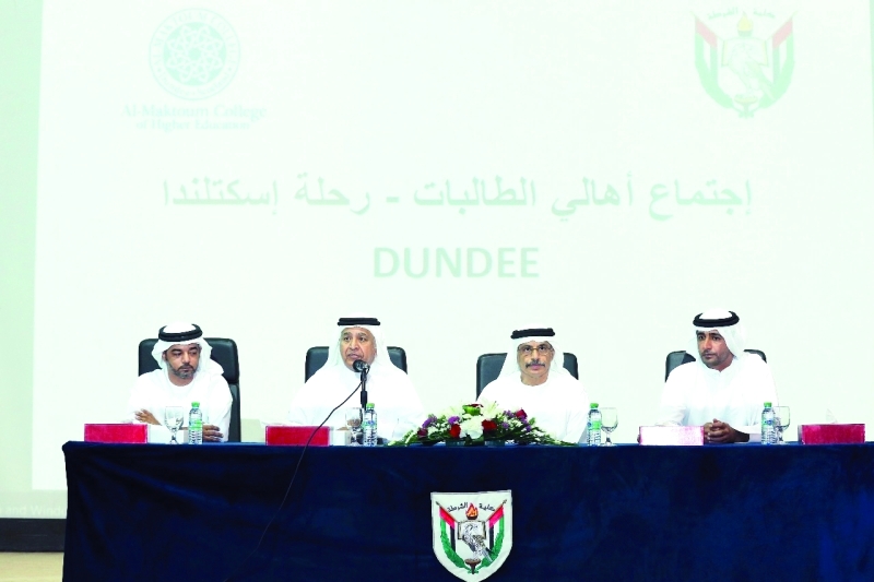 نظمت كلية آل مكتوم للتعليم العالي في اسكتلندا في قاعة الاتحاد بمقر كلية الشرطة أبوظبي لقاءً مع أولياء طالبات الجامعات المشاركات في برنامج التعددية الثقافية ومهارات القيادة الذي يبدأ اعتباراً من 9 يوليو المقبل ويستمر على مدار شهر.
