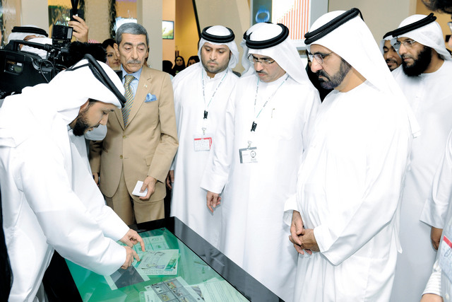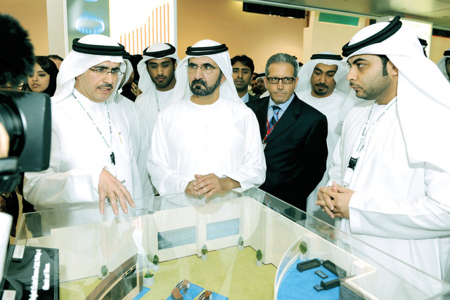 واستمع سموه إلى شرح المهندس سعيد محمد الطاير عضو مجلس الإدارة المنتدب الرئيس التنفيذي للهيئة حول مشاريع " ديوا" لتوليد الطاقة خاصة مشاريع الطاقة الشمسية الصديقة للبيئة وشاهد سموه عدداً من مجسمات محطات التوليد في جبل علي وغيرها كمشروع مجمع محمد بن راشد آل مكتوم للطاقة الشمسية ومركز دبي المتميز لضبط الكربون والمبادرات العديدة لهيئة دبي للكهرباء والمياه والمجلس الأعلى للطاقة في دبي . وتابع صاحب السمو الشيخ محمد بن راشد آل مكتوم جولته في المعرض وتعرف إلى التقنيات الحديثة في مجال توليد وتقنين الطاقة وترشيد المياه والتي تعرضها أكثر من مئة شركة وطنية وعالمية .