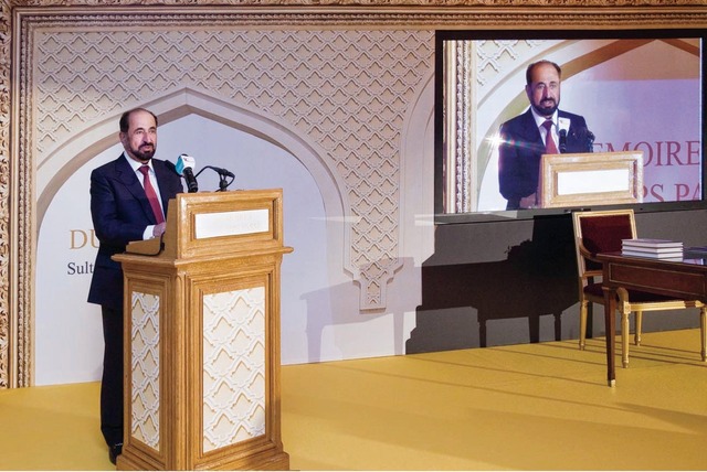 وألقى صاحب السمو الشيخ الدكتور سلطان بن محمد القاسمي عضو المجلس الأعلى حاكم الشارقة، كلمة أعرب فيها سموه عن بالغ إعجابه بفرنسا بشكل عام، وباريس بشكل خاص، لما لها من دور في ترسيخ الثقافات الإنسانية واحترام الحريات الفكرية والنهوض بالآداب والفنون والتراث وتشجيعها للإبداع بمختلف أنواعه وأشكاله.