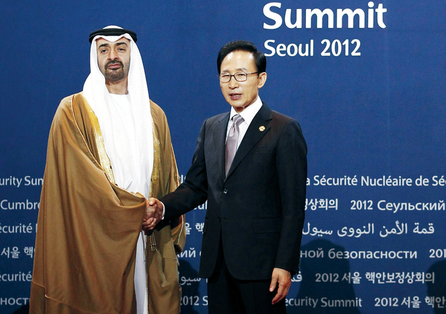 بحث الفريق أول سمو الشيخ محمد بن زايد آل نهيان ولي عهد أبوظبي نائب القائد الأعلى للقوات المسلحة، مع فخامة لي ميونغ باك رئيس جمهورية كوريا مجمل علاقات التعاون القائمة بين البلدين وسبل دعمها وتطويرها بما يخدم المصالح المشتركة ويرسخ أوجه الشراكة المتنامية بين الجانبين. جاء ذلك لدى استقبال رئيس جمهورية كوريا الجنوبية لسمو ولي عهد أبوظبي رئيس وفد الدولة إلى قمة الأمن النووي 2012 بمقر مركز كويكس للمؤتمرات في العاصمة سيئول والوفد المرافق.