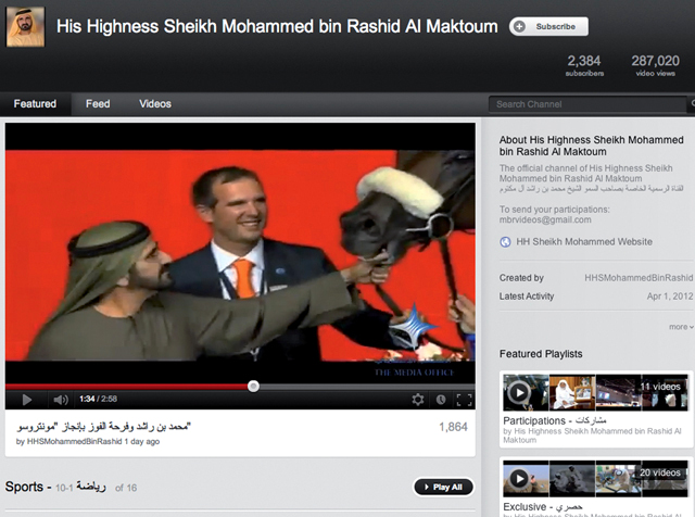وعبر القناة الرسمية الخاصة بسموه على موقع «يوتيوب» والتي تجاوز عدد متابعي الفيديوهات الخاصة بسموه الـ 200 ألف مشاهد، يتم نشر آخر الفيديوهات المتعلقة بنشاطات صاحب السمو الشيخ محمد بن راشد آل مكتوم نائب رئيس الدولة، رئيس مجلس الوزراء، حاكم دبي، رعاه الله، حيث نشر مؤخراً فيديو حضور سموه منافسات كأس دبي العالمي، والذي شهد فوز «مونتيروسو» بكأس دبي العالمي، كما نشر في قناة سموه فيديو استقبال سموه لشخصيات اقتصادية ورياضية عالمية، وكذلك فيديو استقبال سموه للمشاركين في كأس دبي العالمي. وتتيح القناة الرسمية لسموه عبر «يوتيوب» العديد من الفيديوهات الخاصة، حيث يوجد فيديوهات لخطابات سموه ومشاركته في العديد من المحافل المحلية والعربية والعالمية.