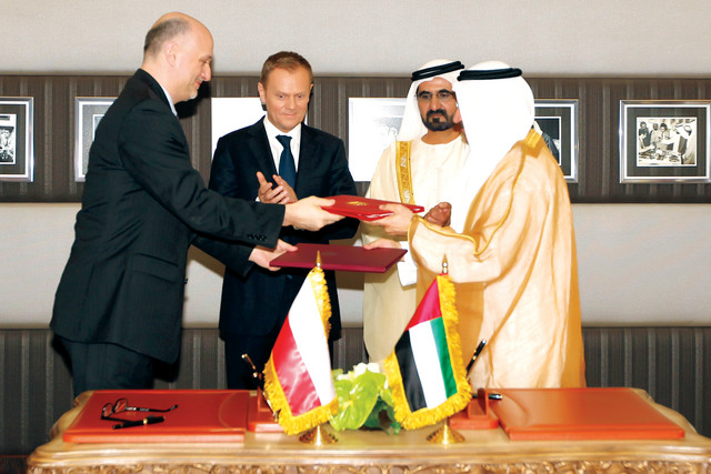 وقد شهد صاحب السمو الشيخ محمد بن راشد آل مكتوم والفريق سمو الشيخ سيف بن زايد آل نهيان وسمو الشيخ منصور بن زايد آل نهيان ودونالد تاسك رئيس الوزراء بجمهورية بولندا مراسم توقيع اتفاقية التعاون الاقتصادي واتفاقية الإعفاء المتبادل لتأشيرات الدخول للدبلوماسيين بين دولة الإمارات وجمهورية بولندا التي تمت في قصر الرئاسة صباح أمس.