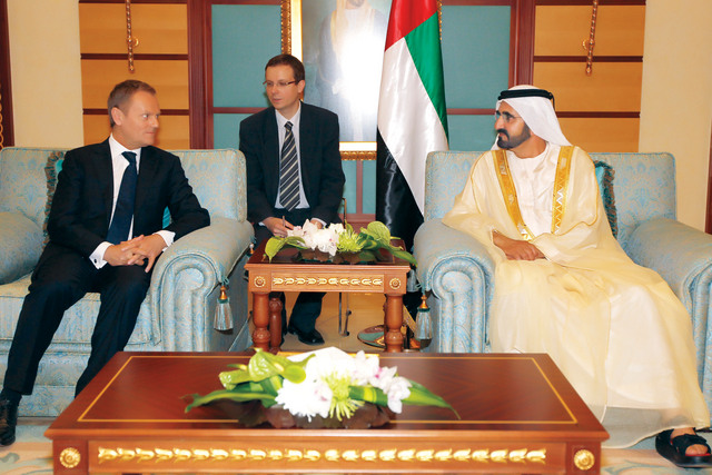 استقبل صاحب السمو الشيخ محمد بن راشد آل مكتوم نائب رئيس الدولة رئيس مجلس الوزراء حاكم دبي رعاه الله في قصر الرئاسة قبل ظهر أمس بحضور الفريق سمو الشيخ سيف بن زايد آل نهيان نائب رئيس مجلس الوزراء وزير الداخلية وسمو الشيخ منصور بن زايد آل نهيان نائب رئيس مجلس الوزراء وزير شؤون الرئاسة ومعالي الشيخ نهيان بن مبارك وزير التعليم العالي والبحث العلمي ودونالد تاسك رئيس الوزراء البولندي والوفد المرافق.