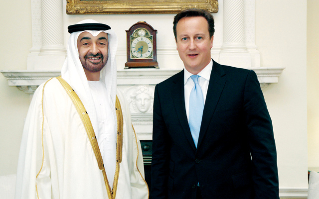 بحث الفريق أول سمو الشيخ محمد بن زايد آل نهيان، ولي عهد أبوظبي نائب القائد الأعلى للقوات المسلحة، مع رئيس وزراء بريطانيا، ديفيد كاميرون، في لندن جوانب التعاون بين البلدين الصديقين، وسبل دعم العلاقات المتميزة، في ظل ما يربط البلدين من روابط صداقة متينة ومصالح مشتركة بما يخدم الشعبين الصديقين.