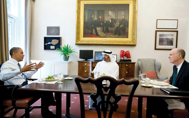 ناقش الفريق أول سمو الشيخ محمد بن زايد آل نهيان، ولي عهد أبوظبي نائب القائد الأعلى للقوات المسلحة، أمس، خلال مأدبة غداء مع الرئيس الأميركي باراك أوباما في البيت الأبيض، عدداً من القضايا الإقليمية والعلاقات الواسعة التي تربط بين البلدين. وتعهد سمو الشيخ محمد بن زايد والرئيس أوباما بمواصلة التعاون الوثيق في المجالين الأمني والتجاري.