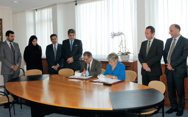 وفي احتفال جرى في المقرّ الرئيسي للمنظمة بباريس عكس متانة وعمق التعاون بين الإمارات واليونسكو وقع الاتفاقية معالي حميد محمد عبيد القطامي وزير التربية والتعليم رئيس المركز وايرينا بوكوفا مدير عام منظمة الأمم المتحدة للتربية والعلم والثقافة بحضور محمد مير عبدالله الرئيسي سفير الدولة لدى الجمهورية الفرنسية والمندوب الدائم للدولة لدى اليونسكو عبدالله علي مصبّح النعيمي ومدير المركز الإقليمي للتخطيط التربوي في الشارقة، ومهرة هلال المطيوعي والسكرتير الثاني في سفارة الدولة لدى فرنسا عبدالله حسن عبيد الشامسي ومدير المعهد الدولي للتخطيط التربوي خليل محشي ومساعد المدير العام لليونسكو للعلاقات الخارجية وإعلام الجمهور اريك فالت.
