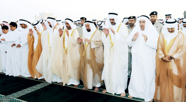 وعقب صلاة العيد ، تبادل صاحب السمو حاكم الشارقة التهاني بهذه المناسبة الإسلامية الكريمة مع مهنئيه من الشيوخ وكبار المسؤولين ووجهاء واعيان البلاد والمواطنين والمقيمين من أبناء الجاليات العربية والإسلامية.