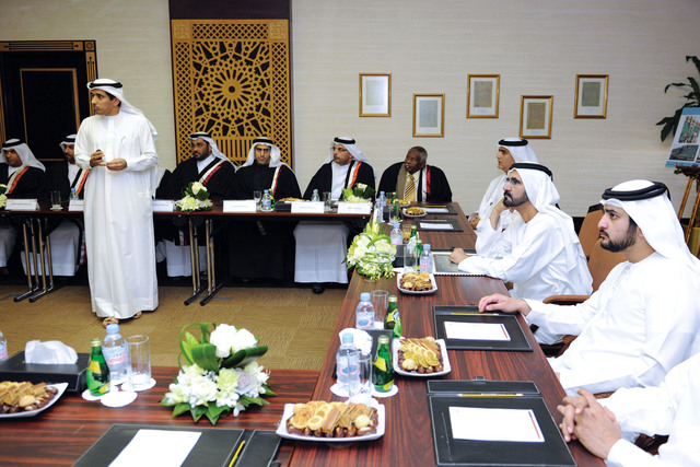 وشاهد سموه بحضور سمو الشيخ مكتوم بن محمد بن راشد آل مكتوم نائب حاكم دبي رئيس المجلس القضائي بدبي ومعالي محمد ابراهيم الشيباني مدير عام ديوان صاحب السمو حاكم دبي وعصام عيسى الحميدان النائب العام في دبي وأحمد عبد الله الشيخ مدير عام المكتب الاعلامي لحكومة دبي وخليفة سعيد سليمان مديرعام دائرة التشريفات والضيافة بدبي عرضا موجزا للانجازات التي تمت في محاكم دبي في إطار استراتيجية حكومة دبي 2015 قدمه الدكتور أحمد بن هزيم السويدي مدير عام المحاكم الذي أوضح أن ما يقارب 190 قاضيا يعملون في محاكم دبي منهم ثلاثة وستون قاضيا مواطنا ينظرون سنويا أكثر من سبعين الف قضية مسجلة في محاكم الاحوال الشخصية والابتدائية والاستئناف والتمييز إلى جانب المحاكم المتخصصة التي أنشئت العام 2008 وأهمها مركز الصلح المختص بالتسوية الودية بين المتخاصمين قبل عرض قضاياهم على المحاكم والذي حقق نتائج ايجابية جدا على صعيد تحقيق الصلح بين المتخاصمين خاصة في القضايا العقارية والمدنية والتجارية.