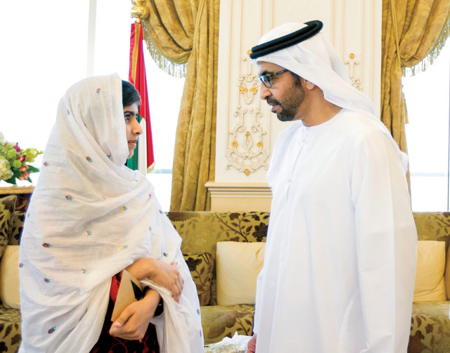 واطمأن سمو ولي عهد أبوظبي على صحة (مالالا) بعد خضوعها للعلاج في المملكة المتحدة من إصابات تعرضت لها في الرأس وهي تدافع عن حقها وحق البنات في الذهاب الى المدارس وتلقي العلم متمنيا سموه الشفاء التام لها، وفي طريقها لأداء مناسك العمرة طلبت مالالا التوقف في أبوظبي لتقديم الشكر لدولة الإمارات العربية المتحدة ولسمو ولي عهد أبوظبي على الجهود التي بذلها في تقديم المساعدة لها ووقوفه بجانبها في محنتها ودوره في إبراز الجوانب الإنسانية العظيمة في تعاليم ديننا الإسلامي.