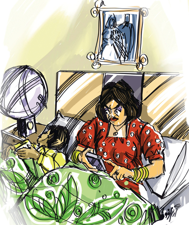وفي الليل وبعد أن ينام تنسحب من غرفة النوم الى غرفة المعيشة وتفتح موبايل زوجها وترصد الأرقام الصادرة والواردة اليه، كما تقرأ الرسائل المتبادلة، ثم تعود أدراجها إلى غرفة النوم، وتبقى قلقة جداً على زوجها. لأنه وسيم وناجح في عمله خاصة وأن شركته ترسله إلى بلدان عديدة في مهمات عمل ويعود اليها محملا بالهدايا.