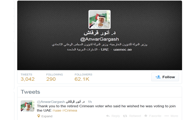 وقال معاليه على حسابة في التويتر :" نشكر الناخب المتقاعد في شبه جزيرة  القرم والذي قال إنه كان يتمني لو كان يصوت للانضمام إلى دولة الامارات العربية المتحدة .
