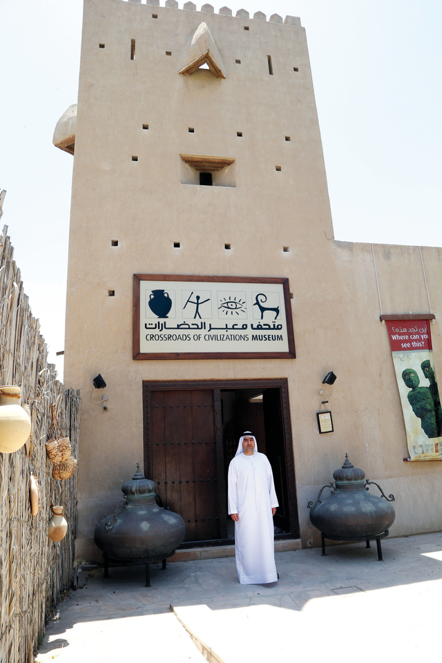 يقول احمد عبيد المنصوري: متحف «معبر الحضارات» يتحدث عن قصة دبي، والإمارات بشكل عام التي عرفت، كما تدل الحفريات إلى حوالي 3000 سنة قبل الميلاد، كمنطقة عبور، للاستيراد وإعادة التصدير، ونقطة التقاء بين الشرق والغرب، ومثّل خور دبي جسراً يفد إليه الناس، لتبادل البضائع والمقايضة، وفق قيم تاريخية متجذرة تعزز دوره الريادي، ودور سكان المنطقة الحضاري في التبادل الثقافي والمعرفي، لذلك أدت المنطقة دوراً محورياً في نقل المعرفة، ودبي ومناطق عديدة من مناطق الدولة، ذكرت في كتب تاريخية قديمة، منها كتاب جاسبرو بالبي النادر، والذي احتفظ به ضمن مجموعة الكتب النادرة، وهو عبارة عن رحلاته التي قام بها في أجزاء كبيرة في منطقة الخليج وبعد البلاد العربية، وبدأ رحلته في عام 1579 واستمرت الى عام 1588، وفي عام 1589 طبع هذا الكتاب، وهذا ما يدل على ان مناطق من الامارات مثل دبي وبني ياس ورأس الخيمة، شهدت زيارات لرحالة عرب وأجانب، كذلك من الوثائق التي توجد في المتحف، خرائط قديمة تعود الى مئات السنين، وتشير الى خريطة منطقة الخليج، باسم الخليج العربي، وهذا توثيق برسم كبار الرسامين الذين وضعوا الخرائط، إذاً متحف «معبر الحضارات» معبر لكل الحضارات، وأعتقد أننا بهذا العمل نكون قد أرسينا مبدأً جميلاً وهو تعريف جيل الشباب بالحضارات القديمة.
