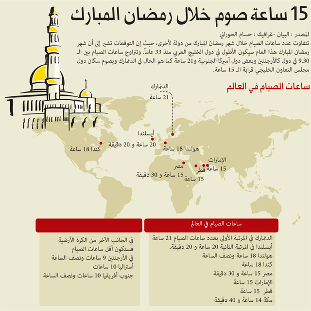 كشف قسم البحوث بدائرة الشؤون الإسلامية والاوقاف والعمل الخيري بدبي أن شهر رمضان المقبل 1435 هـ - 2014 م، سيكون الأطول نهاراً منذ سنين طويلة، ومن ضمن أشد الفترات حرارةً على الدولة ودول الخليج العربي بشكل عام.