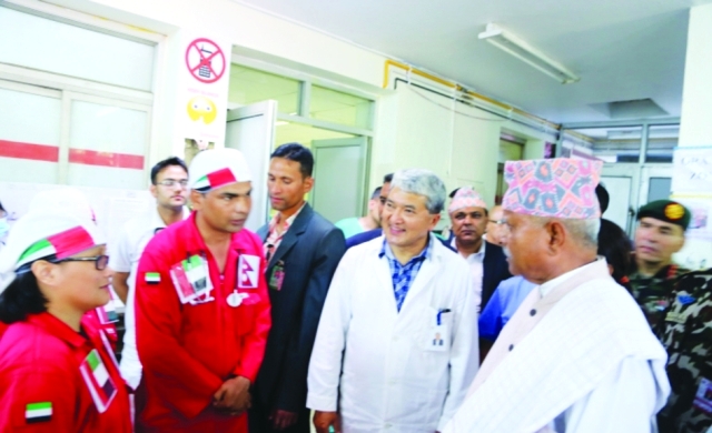 واطمأن رئيس نيبال على أحوال المرضى من المصابين من جراء الزلازل واستعدادات وتجهيزات المستشفى الميداني والمتحرك استعدادا للافتتاح الرسمي خلال الايام القادمة بحضور ممثلين من العديد من الهيئات الانسانية والاغاثية العالمية وكبار المسؤولين النيباليين. والتقى رئيس النيبال خلال زيارته المستشفى الميداني الطاقم الطبي والاداري والفني الاماراتي والنيبالي من العاملين في مختلف اقسام المستشفى الميداني التطوعي.