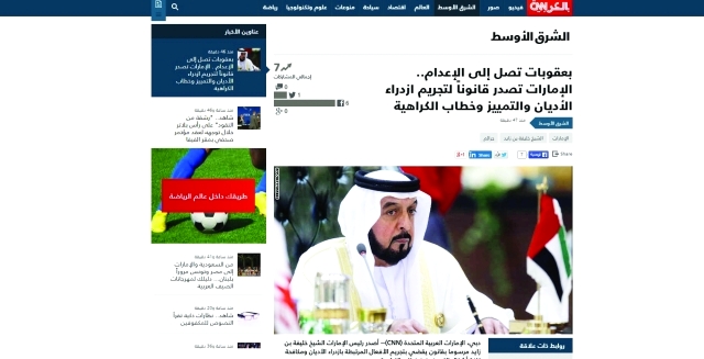 وقالت إن القانون يجرم السب أو الإهانة بسبب أي من العناصر السابق ذكرها وتتراوح العقوبة بين السجن لمدة ستة أشهر إلى أكثر من 10 سنوات وغرامات مالية تصل إلى مليوني درهم. ومن بين وسائل الإعلام العربية التي أبرزت الخبر أمس، «العربية نت»، وموقع «إيلاف» الإلكتروني، وصحف «الحياة» اللندنية، و«الشرق الأوسط»، والرياض»، وغيرها من وسائل الإعلام العربية.