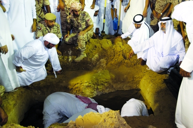 ووري جثمان الشهيد الثرى في مقبرة القصيص بدبي مساء أمس بعد أن أدى المشيعون صلاة الجنازة في مسجد علياء سلطان لوتاه في الورقاء 4، بحضور معالي الشيخ نهيان بن مبارك آل نهيان وزير الثقافة والشباب وتنمية المجتمع، وعدد كبير من الضباط والأفراد في القوات المسلحة وجموع المواطنين الذين توافدوا من شتى أرجاء الإمارات، للمشاركة في التشييع، وأمّ المصلين شقيق زوجة الشهيد.