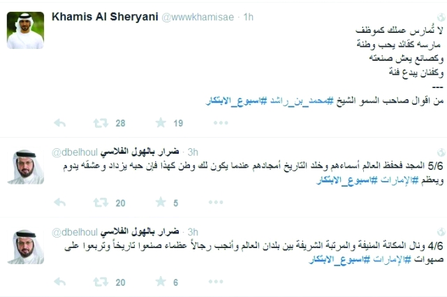 وغرد عبد العزيز: «أنا أقترح أن يكون صاحب السمو الشيخ محمد بن راشد آل مكتوم هو قائد التنمية في دول الخليج العربي، فهو رجل ثقة، ويفعل ما يقول.. بالعربي رجل إنجازات»، وقال حمد: «لا بد أن يكون الابتكار في التفكير البسيط، لأن المشكلة فينا أنه في علمنا حينما نسمع كلمة ابتكار تتبادر إلى الذهن الأشياء المعقدة»، وتفاعل محمد الكتبي: «أتمنى أن يتم تخصيص تكريم لأفضل مدرس مثلاً أو مسؤول أسهم بشكل مؤثر وبارز في إعداد طلبة أو موظفين مبتكرين بكفاءة وتميز»، وغرّد سعيد محمد آل علي: «أقترح مساعدة صغار المبتكرين والموهوبين بتسجيل براءة اختراع لابتكاراتهم، عبر مؤسسه قانونية تحفظ حقهم المادي والمعنوي»، ودوّن عمر بو عميم: «لا بد من تشجيع الأساليب العملية الابتكارية»، وتفاعل مانع الجابري: «أقترح مجموعة شركات أدنوك الإمارات العالمية للألمنيوم شركة مصدر»، ودوّنت خلود الكندي: «صراحة، مصدر في أبوظبي يستأهلون كل خير، وجامعة خليفة، هما من يحفزان الابتكار، وتليهما جامعة زايد وكليات التقنية، رأي شخصي لا أكثر»، وبين عبد الله الشحي: «منصة لتكريم الإبداع والمبدعين»، وقال محمد آل حطاب: «أقترح أن تستضيف دبي سنوياً أفضل مئة من طلاب وطالبات الدول العربية لملتقى إبداعي، ليتم استقطاب أفضل عشرة منهم للعمل في دبي».