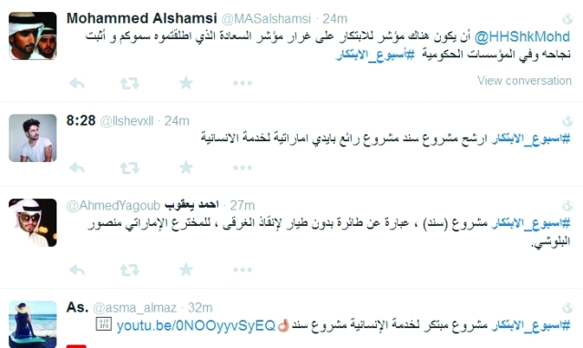 وبين د. محمد يوسف: «الإبداع يعرف هذا الوطن جيداً، والابتكار طريق ستنيره الإمارات بإذن الله بالسواعد الوفية لهذه الأرض»، وتفاعل إبراهيم بهزاد: «حكومتنا تستمع لآرائنا وتثمنها، وتشجعنا على المبادرة في الابتكار وطرح الأفكار لتقديم أفضل الخدمات»، ودونت سما دبي: «أفضل مشروع للعام سند الذي نال صيتاً كبيراً بين وسائل الإعلام، عبارة عن طائرة بدون طيار لإنقاذ الغرقى»، في حين تفاعلت جريدة الاتحاد: «مثّل الاحتفاء بأكثر مدرس ابتكاراً وأكثر مسؤول يؤمن بالابتكار وأفضل جهة حكومية تحسنت بالابتكار»، وتفاعلت آيا: «وضع صناديق اقتراحات لأفكار مبتكرة، كل صندوق يختص في مجال معين، مثال الصحة، التعليم، السياحة، والبيئة»، وغردت الشارقة للأخبار: «مؤسسة الشارقة للإعلام تدعم الشباب وروح الابتكار»، وقالت جامعة العين للعلوم والتكنولوجيا: «إن مجالات الابتكار متنوعة ومختلفة، تتدرج من ابتكار في العمليات أو الخدمات أو المنتجات أو ريادة الأعمال».