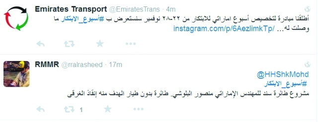 تفاعل مغردون مع مبادرة صاحب السمو الشيخ محمد بن راشد آل مكتوم، نائب رئيس الدولة رئيس مجلس الوزراء حاكم دبي، رعاه الله، في تخصيص أسبوع للابتكار في شهر نوفمبر المقبل، وتسابقت التغريدات عبر وسم #اسبوع_الابتكار إلى تأكيد ثنائها على هذه المبادرة الوطنية، لكونها تساعد أبناء الوطن على الدخول إلى عالم الإبداع من أوسع الأبواب، فيما بدأت تدوينات أخرى التجاوب مع فحوى المبادرة، فدخلت باب الترشيحات، واقترحت أسماء الدوائر والمؤسسات التعليمية والحكومية التي تستحق أن تكون في صدارة القائمة من حيث جهودها في مجال الابتكار.