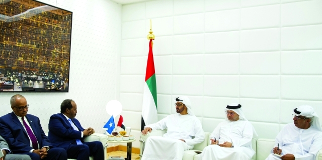 جاء ذلك خلال استقبال سموه أمس في المعمورة بأبوظبي الرئيس حسن شيخ محمود رئيس جمهورية الصومال الذي يزور البلاد حالياً. ورحب صاحب السمو ولي عهد أبوظبي بالرئيس الصومالي والوفد المرافق له وبحث معه تعزيز العلاقات الأخوية بين دولة الإمارات وجمهورية الصومال وسبل تطويرها وتنميتها بما يخدم المصالح المشتركة للبلدين والشعبين الشقيقين.