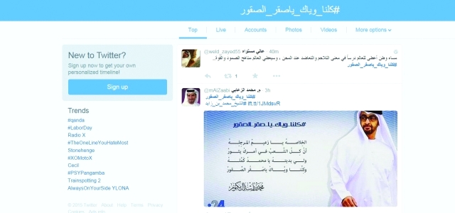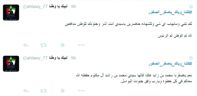 ودونت حبيبة الحوسني مدير عام صندوق الزواج «اللهم استودعناك جيشنا في اليمن فعندك لا تضيع الودائع، وأمرك يا بوخالد على الراس والعين ما جابت العزه غير الفعايل»، وتفاعل عبدالله عقيده مغرداً «صقور الإمارات رهن اشارتك»، وبين محمد بن سعيد «لو على الروح يأمر حاضرين، وللوطــن كلنا درع حصين، وسادة الدار لبينا نداكم وحنا نعم الشباب المخلصين»، ودون طارق محمد أحمد «دامنا بدرب الشهادة ما نهاب شعبك الوافي يردد وبسرور كلنا ينطر إشارة للذهاب»، وجاءت تغريدة سالم العامري «أمر يا بوخالد وحنا لك جنود صوب سلاحك عالعدا وارم».