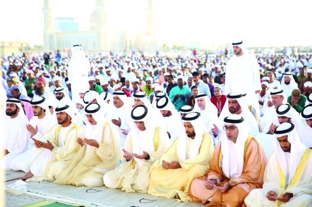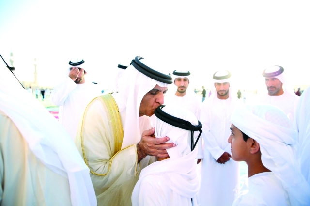 وبعد الانتهاء من أداء الصلاة والخطبة تبادل صاحب السمو حاكم رأس الخيمة التهاني بالعيد المبارك مع الشيوخ وكبار المسؤولين وجموع المصلين.