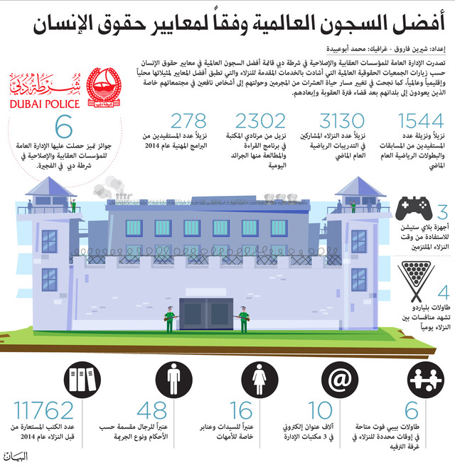 وأضاف مدير إدارة تعليم وتدريب النزلاء بالإدارة العامة للمؤسسات العقابية والإصلاحية في شرطة دبي أن مكتبة النزلاء من الأقسام المهمة التي تبقي النزيل على اتصال دائم مع العالم الخارجي، من خلال الخدمة التي تقدمها المكتبة من استعارة الكتب وتوفير الصحف اليومية، كما تم افتتاح المكتبة الإلكترونية التي تحتوي على 10 آلاف عنوان، وأنه تم تعميمها على الأقسام كافة، ويبلغ عددها 3 مكتبات إلكترونية، كما يوجد في المكتبة 9 آلاف كتاب بـ24 لغة، كي يستفيد منها جميع نزلاء المؤسسات العقابية.