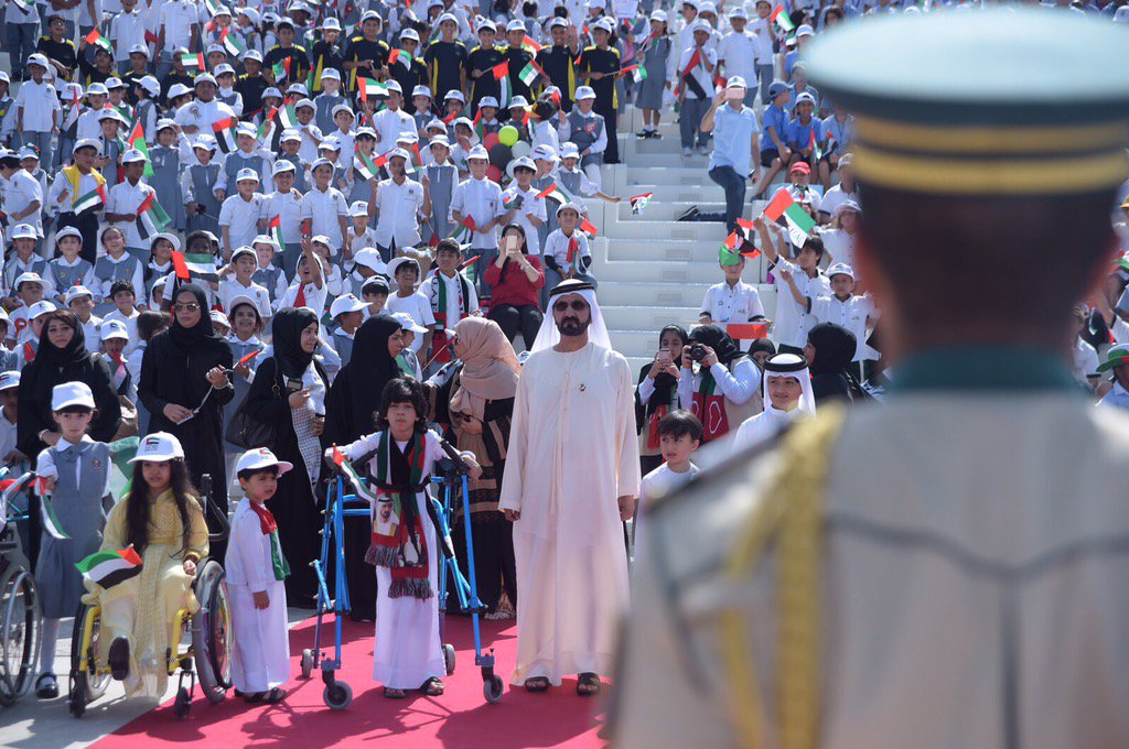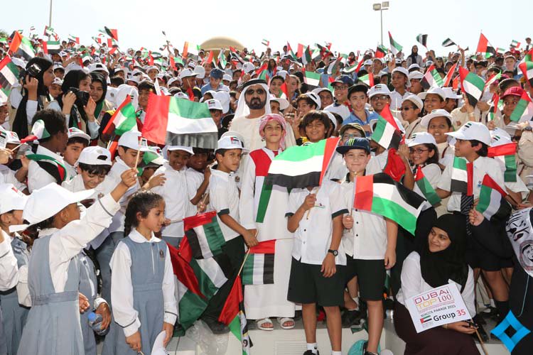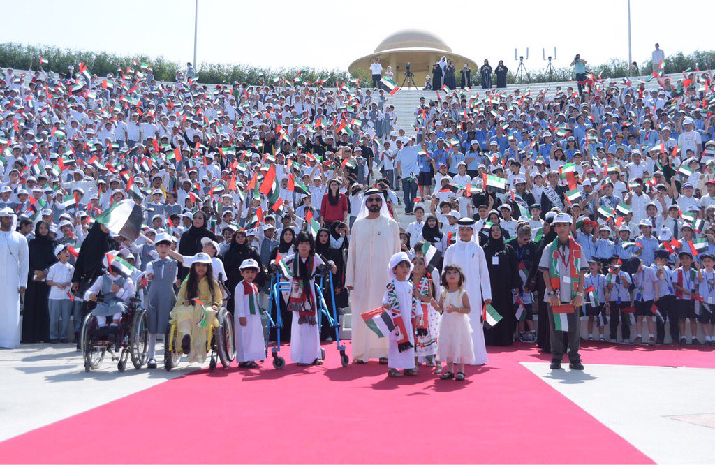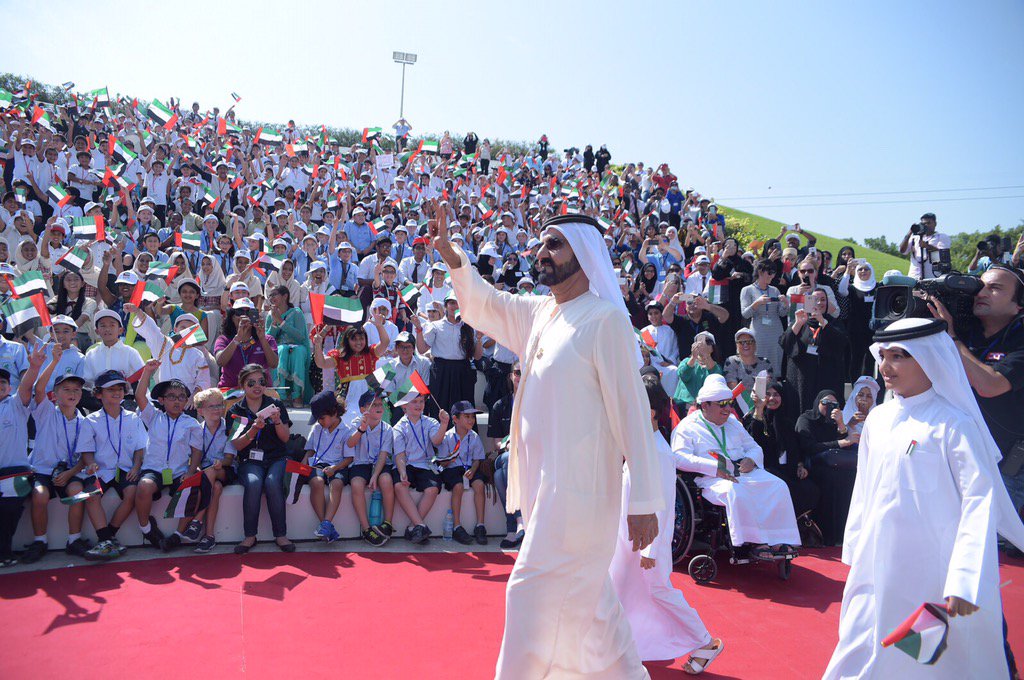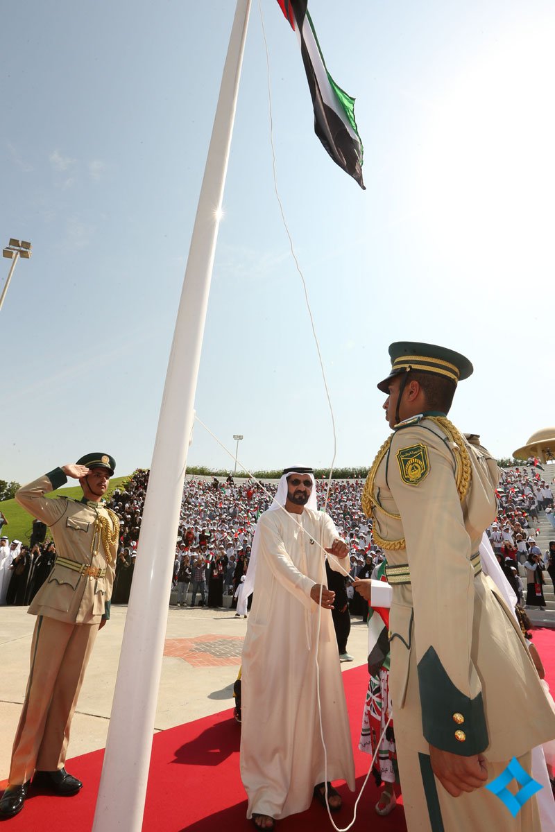 قام صاحب السمو الشيخ محمد بن راشد آل مكتوم، نائب رئيس الدولة رئيس مجلس الوزراء حاكم دبي، رعاه الله، اليوم برفع عَلَم الدولة في تمام الساعة الثانية عشر ظهراً بحديقة الخور في دبي وبمشاركة خمسة آلاف من طلاب وطالبات المدارس في دبي يمثلون أكثر من 100 جنسية، وذلك احتفاءً بـ "يوم العَلَم" الذي يوافق الثالث من نوفمبر كل عام ويصادف ذكرى تولي صاحب السمو الشيخ خليفة بن زايد آل نهيان، رئاسة الدولة.