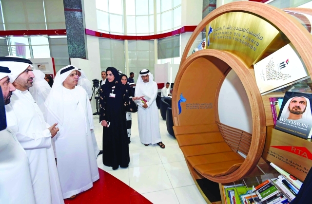 واستمع الطاير وبن حويرب، من موزة المري مديرة إدارة التسويق والاتصال المؤسسي، لشرح عن مبادرة كرسي المعرفة، الذي تحيط به الكتب والمراجع العلمية من كل اتجاه،