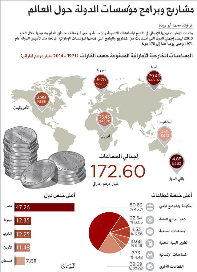 وواصلت الإمارات نهجها الإنساني في تقديم المساعدات التنموية والإنسانية والخيرية لمختلف مناطق العالم وشعوبها خلال العام 2015، ليصل إجمالي الدول التي استفادت من المشاريع والبرامج التي قدمتها المؤسسات الإماراتية المانحة منذ تأسيس الدولة عام 1971 وحتى يومنا هذا إلى 178 دولة.