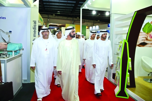 وتجول سموه يرافقه سمو الشيخ حمدان بن محمد بن راشد آل مكتوم ولي عهد دبي وسمو الشيخ مكتوم بن محمد بن راشد آل مكتوم نائب حاكم دبي في أرجاء المعرض الذي تشارك فيه نحو 4000 شركة وطنية وجهة حكومية إلى جانب شركات متخصصة ومستشفيات وجهات طبية من دول المنطقة العربية والعالم..