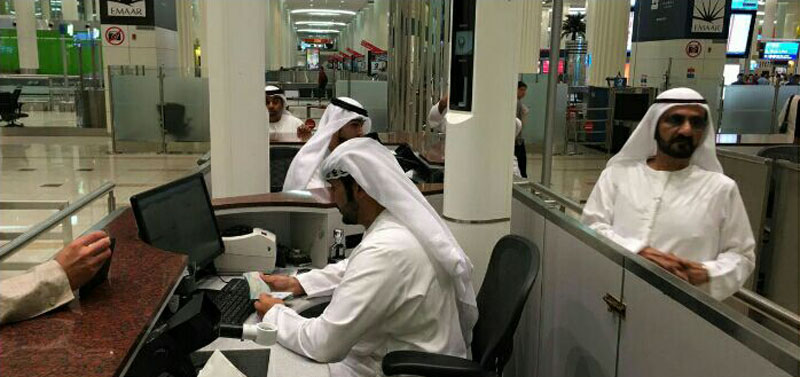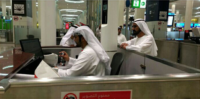 وقالت الإدارة في سلسلة تغريدات عبر حسابها الرسمي في تويتر مرفقة مع صورة "لقطات تظهر مأمور الجوازات خلال إنجازه حركة دخول المسافرة بمتابعة صاحب السمو الشيخ محمد بن راشد آل مكتوم".