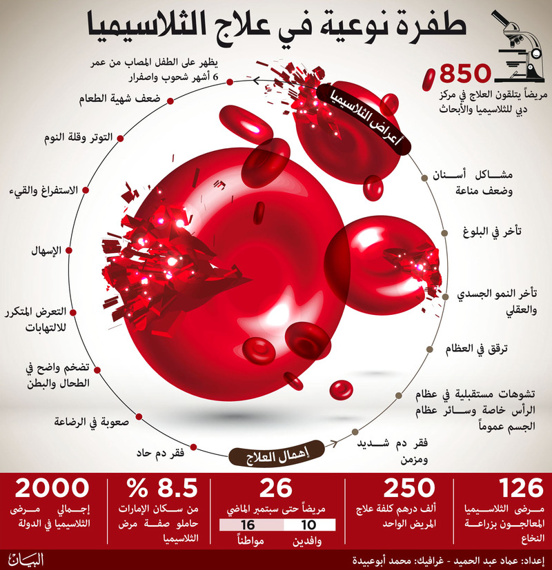 كما أوضح الدكتور عصام أن عدد المرضى الذين يتلقون العلاج في مركز الثلاسيميا بدبي يصل الى 850 مريضاً من مختلف إمارات الدولة، لافتاً إلى انخفاض عدد الإصابات بالمرض بين مواطني إمارة دبي إلى الصفر خلال السنوات الثلاث الأخيرة.