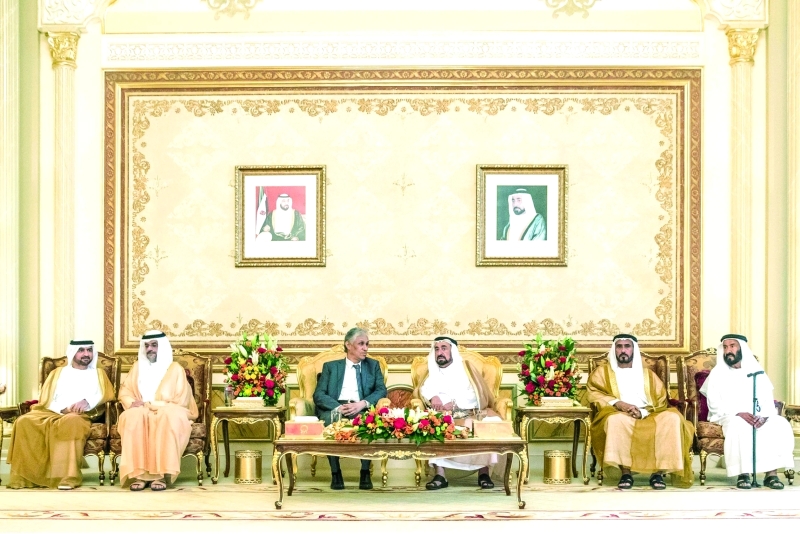 واصل صاحب السمو الشيخ الدكتور سلطان بن محمد القاسمي عضو المجلس الأعلى حاكم الشارقة، وصاحب السمو الشيخ حميد بن راشد النعيمي عضو المجلس الأعلى حاكم عجمان، وصاحب السمو الشيخ حمد بن محمد الشرقي عضو المجلس الأعلى حاكم الفجيرة، وصاحب السمو الشيخ سعود بن راشد المعلا عضو المجلس الأعلى حاكم أم القيوين، وصاحب السمو الشيخ سعود بن صقر القاسمي عضو المجلس الأعلى حاكم رأس الخيمة، استقبال جموع المهنئين بعيد الفطر السعيد.
