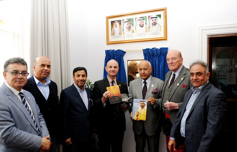 وقام ميرزا الصايغ عضو مجلس أمناء هيئة آل مكتوم الخيرية رئيس مجلس أمناء كلية آل مكتوم للتعليم العالي بإسكتلندا، والكولونيل باتريك كيرينس المدير التنفيذي للمركز، بإزاحة الستار عن اللوحة التي تحمل اسم المكتبة.