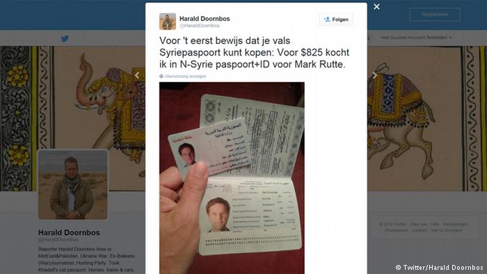 لكن جواز السفر الذي حصل عليه حمل صورة رئيس وزراء بلاده، مارك روتي، مرفقاً باسم عربي. ونشر دورنبوس صوراً للوثائق المزورة على صفحته في موقع "تويتر"، مرفقاً بهذه الرسالة: "هذا دليل أولي على أن شراء جواز سفر وبطاقة هوية سورية مزورة هو أمر بغاية السهولة"، مضيفاً: "كل ما نحتاجه هو 750 يورو ورقم هاتف أحد المزورين".