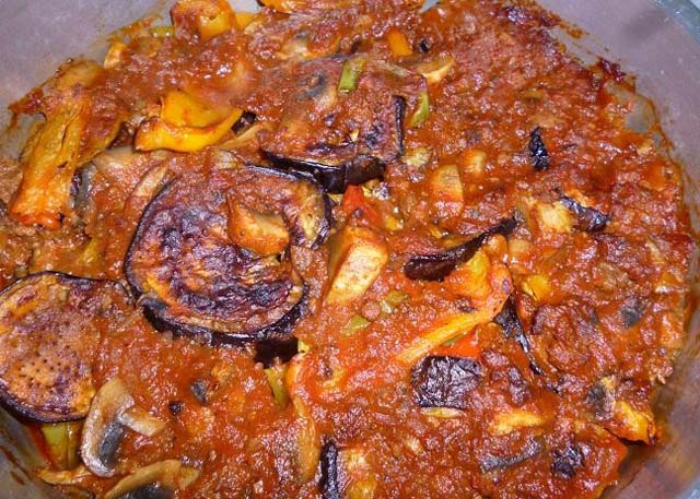 في البداية يتم تقطيع الباذنجان لشرائح تنقع لعشر دقائق في ماء مملح ثم يتم تجفيفها باستخدام مناديل المطبخ الورقية. في هذه الأثناء توضع حبات الطماطم في ماء مغلي ثم تنقل سريعا لماء مثلج حتى يسهل تقشيرها، ثم تقلى شرائح البطاطس في زيت الزيتون، الذي يستخدم أيضا في قلي شرائح الباذنجان.