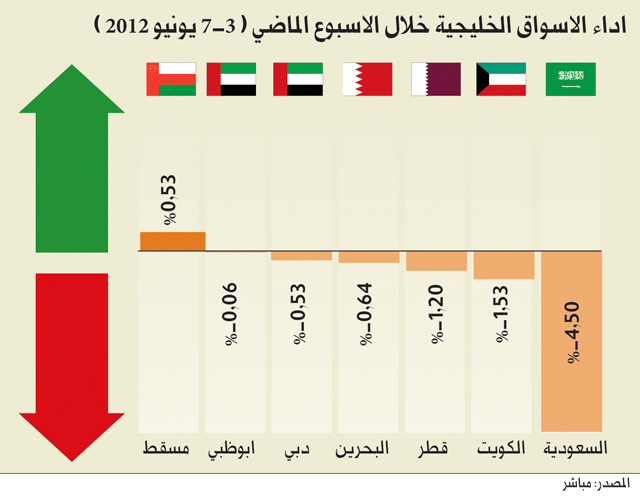 أغلقت مؤشرات 6 أسواق مال خليجية في نهاية تعاملات الأسبوع الماضي متراجعة. وكان مؤشر السوق المالية السعودية «تداول» الأكثر تعرضاً للخسائر بفقدان ما نسبته 4.50 ٪. فيما انفرد مؤشر السوق العُماني بالارتفاع وحيداً بمكاسب نسبتها 0.53 ٪.