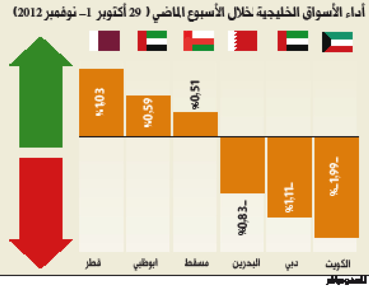 تقاسمت مؤشرات أسواق المال الخليجية الصعود والهبوط بنهاية تداولات الأسبوع الماضي لترتفع مؤشرات ثلاثة أسواق بصدارة المؤشر القطري بينما تراجعت مؤشرات ثلاثة أسواق أخرى تصدرها المؤشر الكويتي.