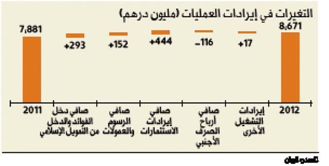 بلغت إيرادات العمليات خلال عام (2012) 8,671 ملايين درهم بزيادة 10 % عن عام 2011، والتي بلغت 7,881 ملايين درهم. وشهد صافي إيرادات الفوائد والدخل الصافي من عمليات التمويل الإسلامي نمواً جيداً خلال عام، وارتفعت بنسبة 5.1 % لتصل إلى 6,096 ملايين درهم. وارتفعت الرسوم والعمولات بنسبة 10.9 % لتبلغ 1,546 مليون درهم في عام 2012، مقارنة بـ 1,394 مليون درهم في عام 2011. وبشكل عام، شهد الدخل من غير الفوائد خلال عام 2012 نمواً جيداً، حيث بلغ معدل الزيادة 23.9 % ليصل إلى 2,575 مليون درهم مدفوعاً بزيادة بلغت 444 مليون درهم في إيرادات الاستثمار مقارنة بعام 2011، وبلغ صافي دخل الاستثمار 537 مليون درهم في عام 2012، وذلك نتيجة لتحسن الأوضاع في الأسواق المالية واستراتيجية التحوط الناجحة.