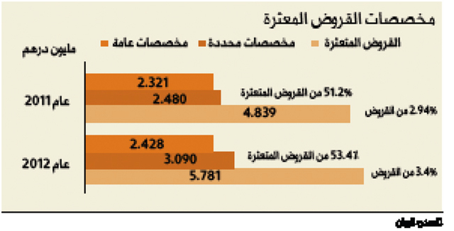 شهدت المخصصات انخفاضاً بنسبة 10.8 % لتصل إلى 1,337 مليون درهم خلال عام 2012، كما انخفضت بنسبة 24.2 % خلال الربع الأخير لتصل إلى 365 مليون درهم. وعلى الرغم من ارتفاع المخصصات المحددة بمقدار 418 مليون درهم، فقد أسهمت الزيادة في مستردات الديون المتعثرة، والتي بلغت 408 ملايين درهم، في انخفاض صافي المخصصات إلى 1337 مليون درهم خلال عام 2012.